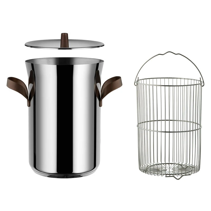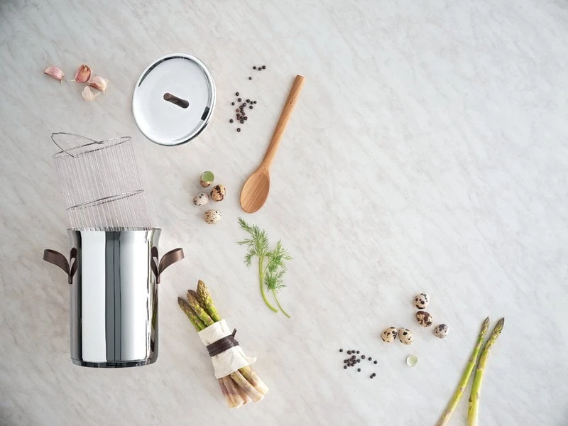 Alessi’s Edo asparagus steamer with basket helps you get the springtime dish just right: the tall and narrow pot keeps the stalks upright so that the bottoms boil while the tops steam above the water. When asparagus is not in season, the pot can be used for cooking spaghetti or vegetables. The Edo asparagus steamer, designed by Patricia Urquiola for Alessi, is made of stainless steel and finished with distinctive, burnished handles.