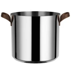 Edo stock pot, designed by Patricia Urquiola for Alessi, is made of stainless steel and finished with distinctive, burnished handles.