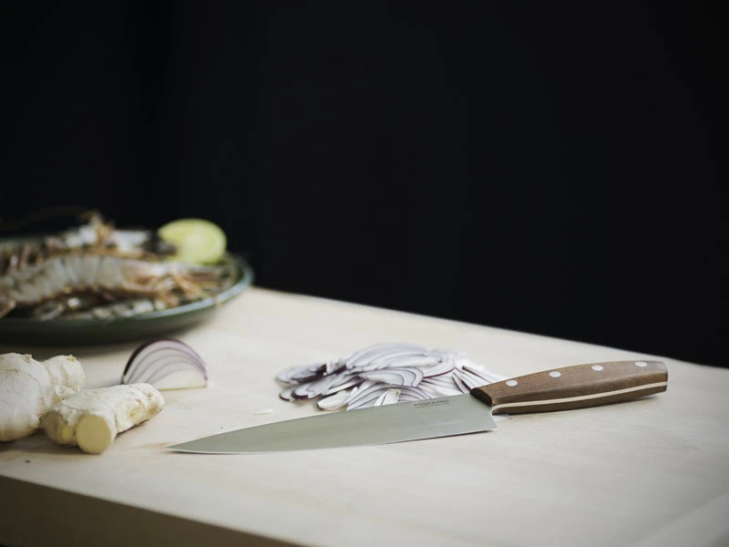Norr chef’s knife, designed by Jacob Leth-Espensen for Fiskars, combines high quality materials with pleasant, ergonomic design, inspired by traditional Nordic kitchen and culture. The wooden handles are crafted of environmentally friendly FSC certified maple: the innovative Kebony technology gives it a rich brown colour and makes it tougher than teak. The Norr blades are made of German steel with a hardness of HRC 54.