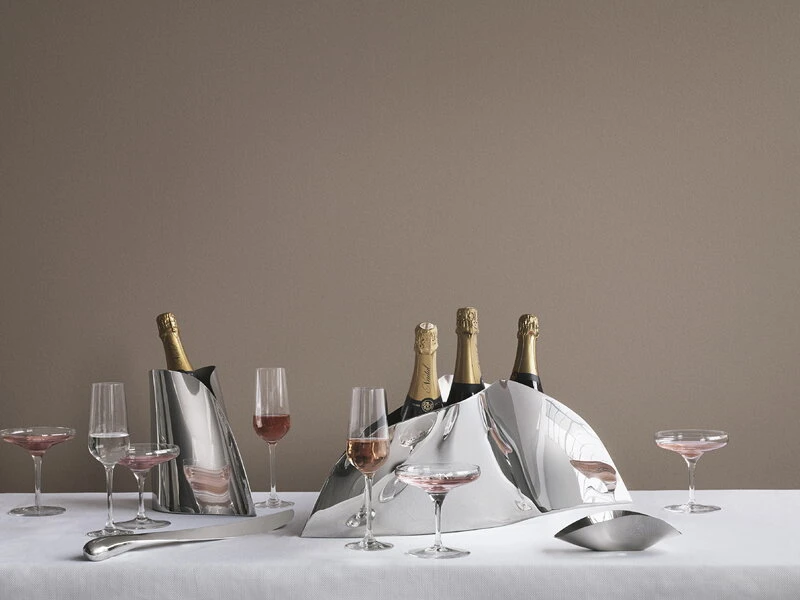 The Indulgence Grand champagne cooler by Georg Jensen instantly elevates any celebration with its sleek design and a hefty dose of pizazz. Conceived by Danish designer Helle Damkjær, the stainless steel cooler fits three wine or champagne bottles, and its abstract form adds a touch of modern Nordic design to any festive table setting, bar cart or cabinet. Whatever the occasion, the Indulgence Grand cooler is sure to make an impression on your guests.